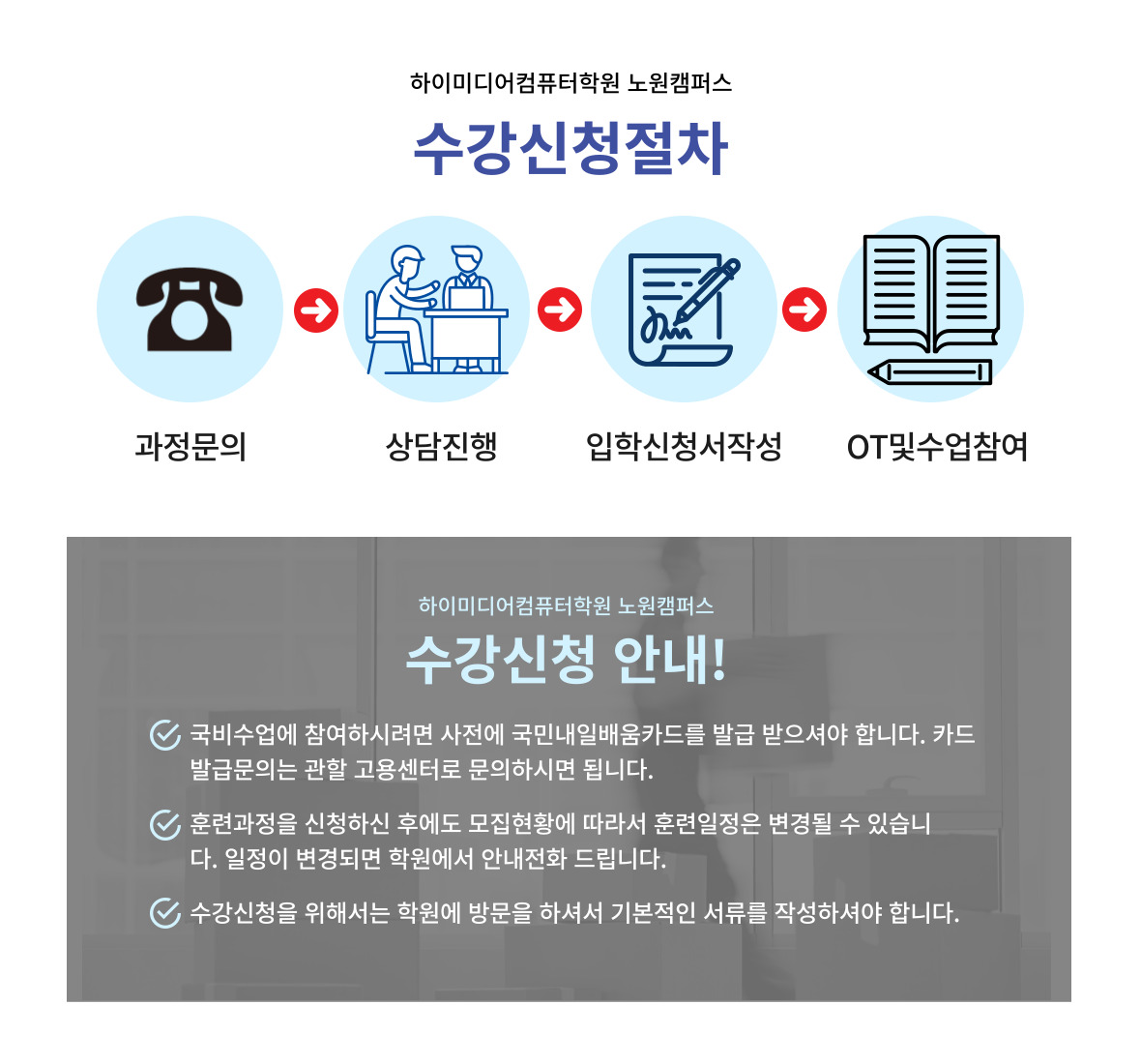 | *매월 과정(과목)별로 시간표는 달라질 수 있습니다.자세한 시간표는 전화주시면 훈련과정 상담과 함께 안내 드리겠습니다. | ||||